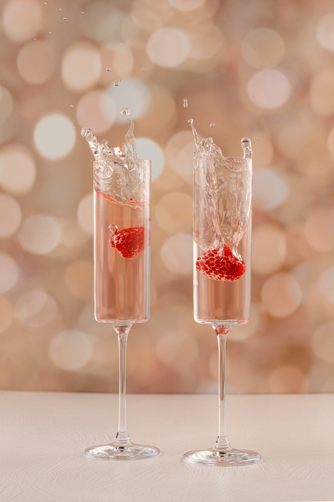 4. À l'aide d'une passoire, versez le mélange dans les flutes à champagne.