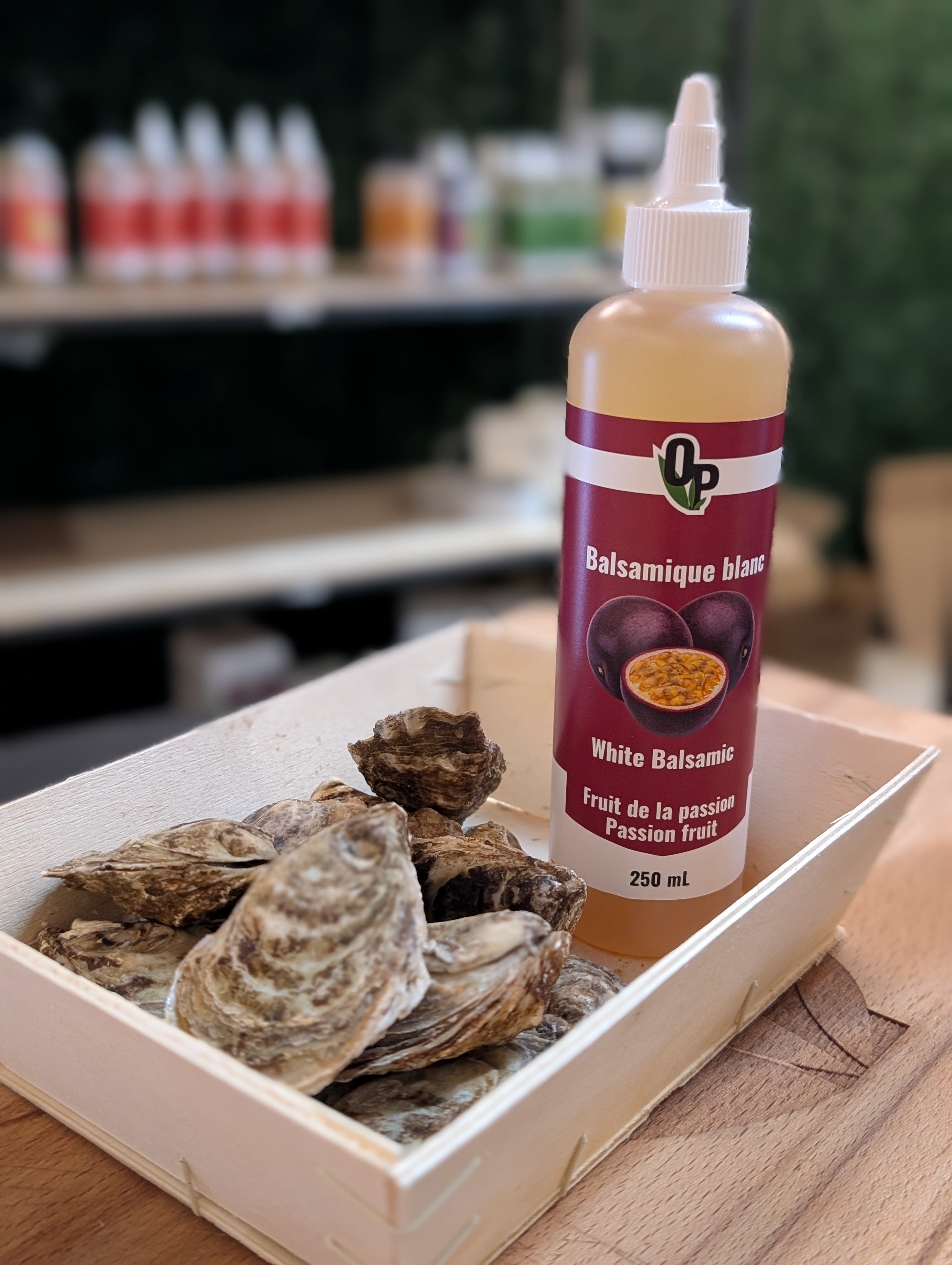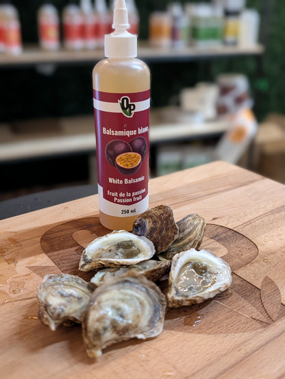 White balsamic vinegar, passion fruit, gourmet vinegar, gourmet condiment, grape must, exotic recipe, quality vinegar, tropical vinaigrette, oyster seasoning, cocktail vinegar.